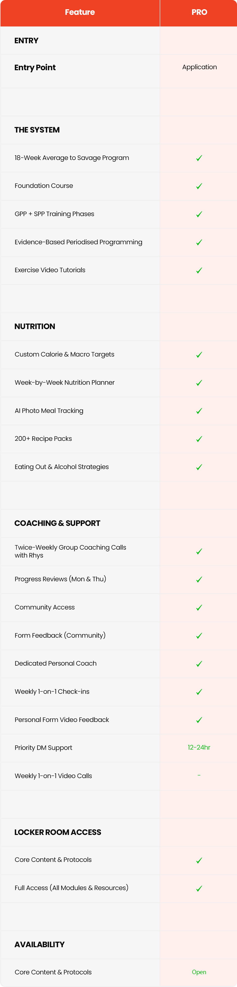 Everything in Pro + Rhys as your personal coach. Weekly 30-min video calls. VIP priority.