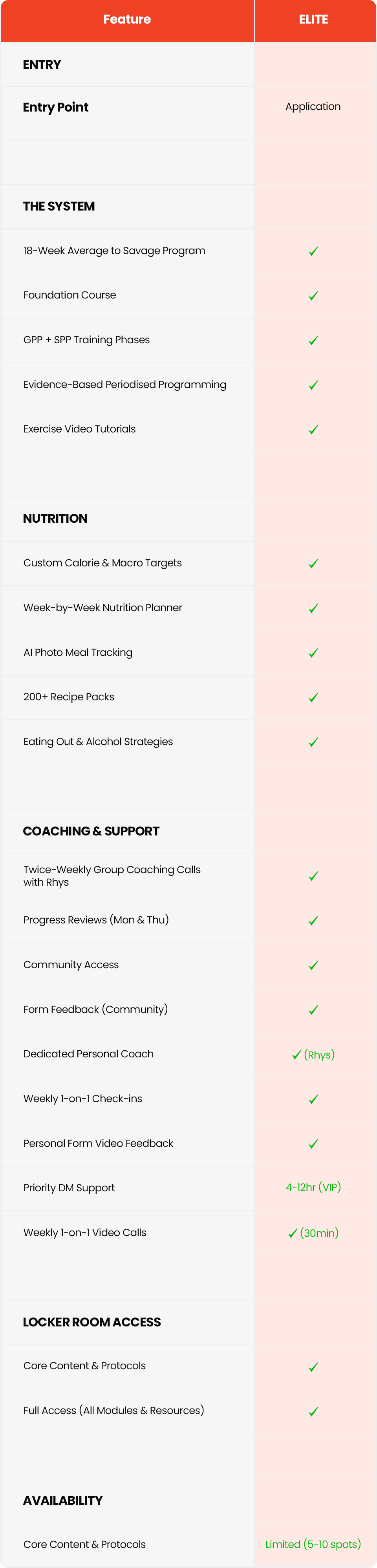 Men who want premium support and invest accordingly. Direct access to Founder Rhys. Limited to 5–10 spots.